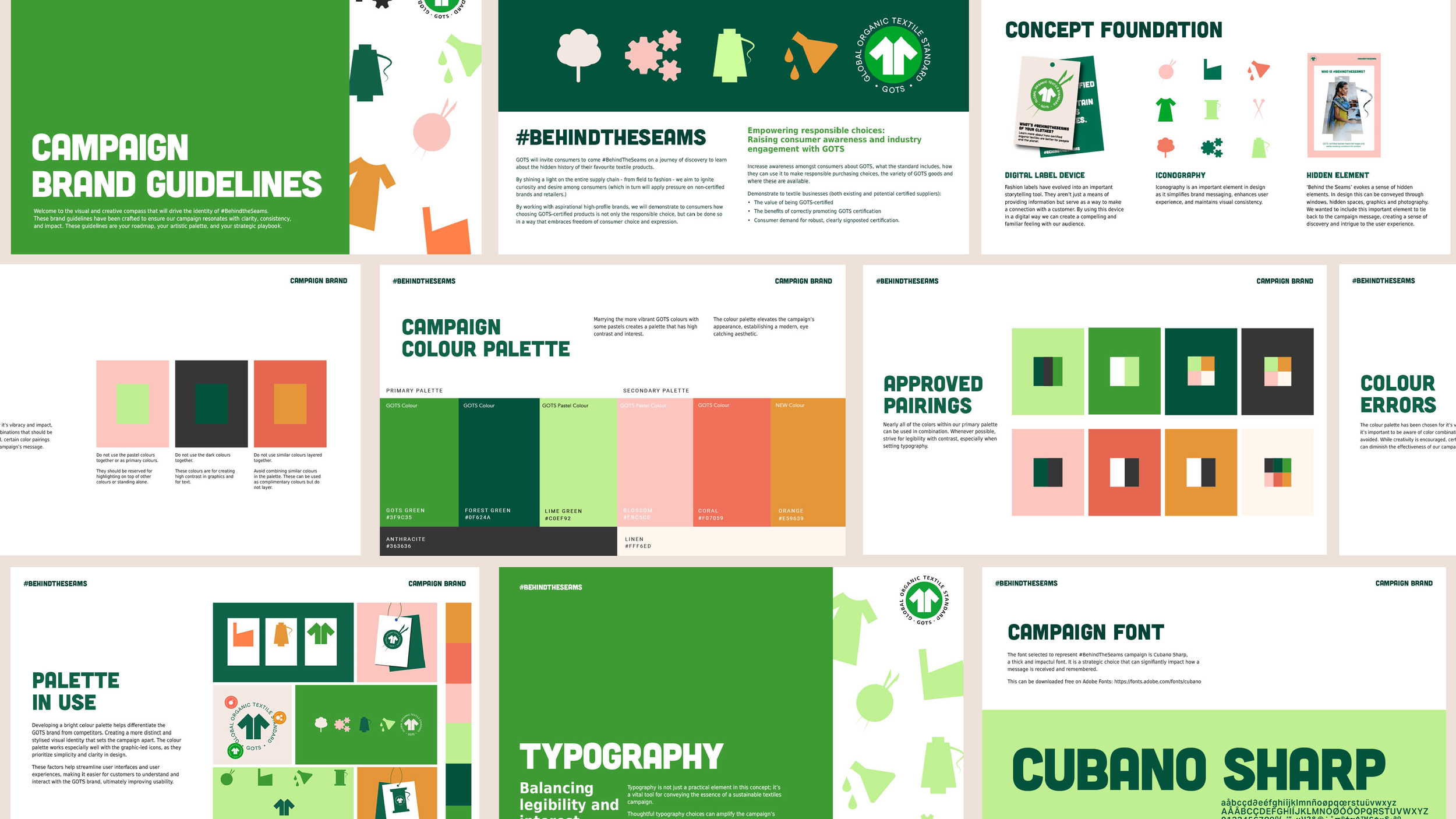 The campaign design has expanded the GOTS logo into a series of icons to simplify brand messaging, enhance user experience, and maintain visual consistency with the branding.