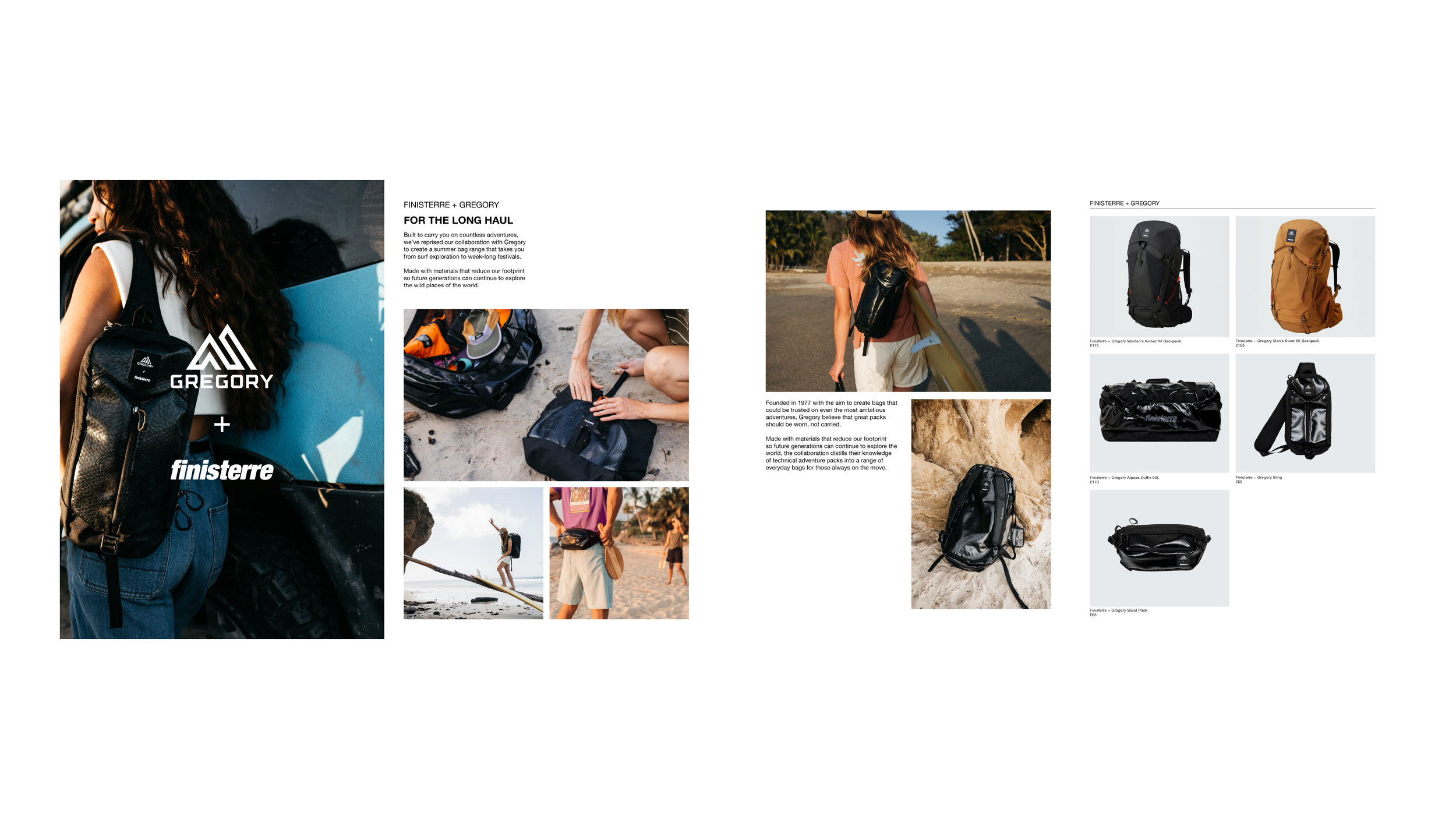 Finisterre collaborated with Gregory to create a summer bag range that takes you from surf exploration to hiking in the mountains. Each bag comes with a lifetime warranty, minimising overconsumption and marrying people with the perfect bag for life.